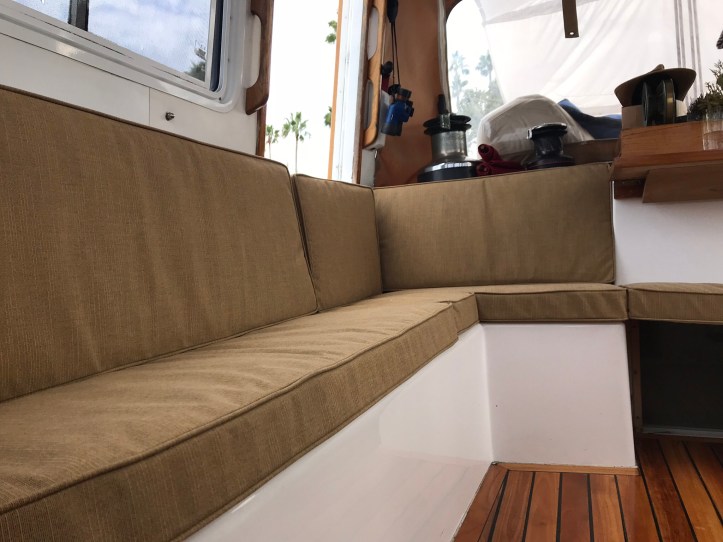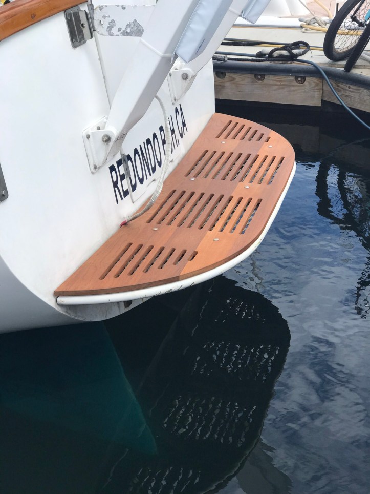 With a month left in Redondo thing are moving along smoothly Bill my Upholstery guru has completed the new pilothouse cushions and is creating the template for the dinghy chaps install. The chaps will give us many more years out of the new Achilles keeping it out of the tropical sun. New teak swim step is sealed and ready for action.